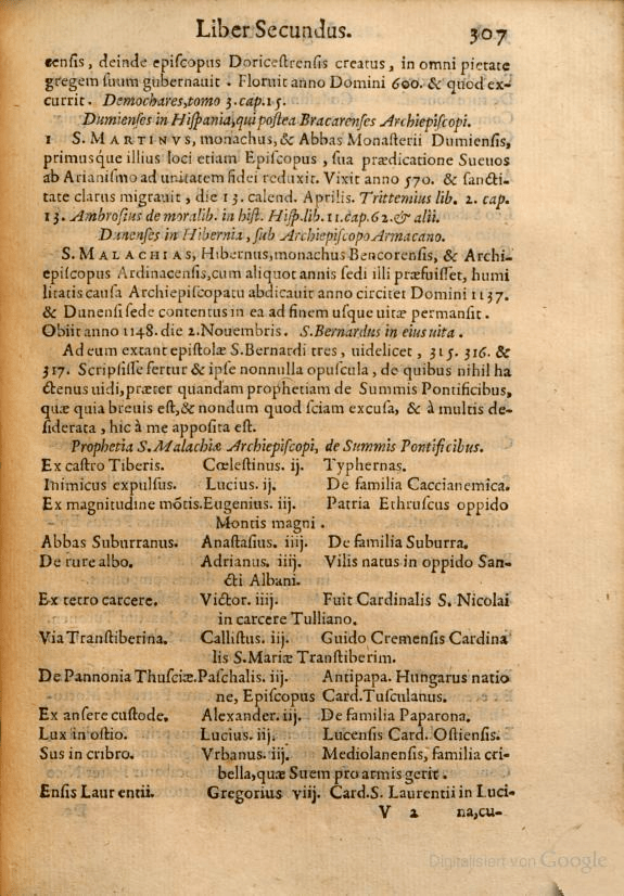| 112 | „IN PERSECUTIONE EXTREMA S.R. ECCLESIAE SEBEDIT PETRUS ROMANUS, QUI PASCET OVES IN MULTIS TRIBULATIONIBUS, QUIBUS TRANSACTIS CIVITAS SEPTICOLLIS DIRUETUR ET JUDEX TREMENDUS JUDICAVIT POPULUM SUUM. FINIS“ (Während der letzten (bzw. äußerst großen) Verfolgung der heiligen Kirche wird Petrus, ein Römer, regieren. Er wird die Schafe unter vielen Bedrängnissen weiden. Dann wird die Siebenhügelstadt zerstört werden und der furchtbare Richter wird sein Volk richten. Ende) |
