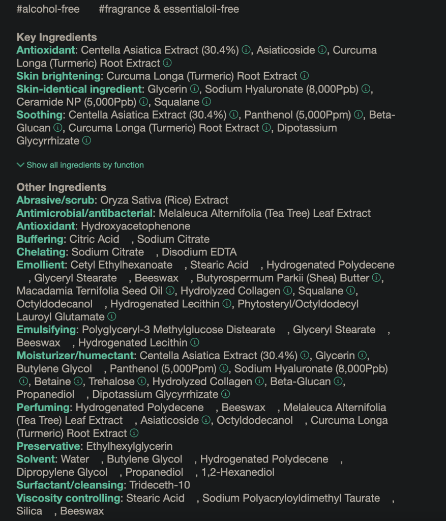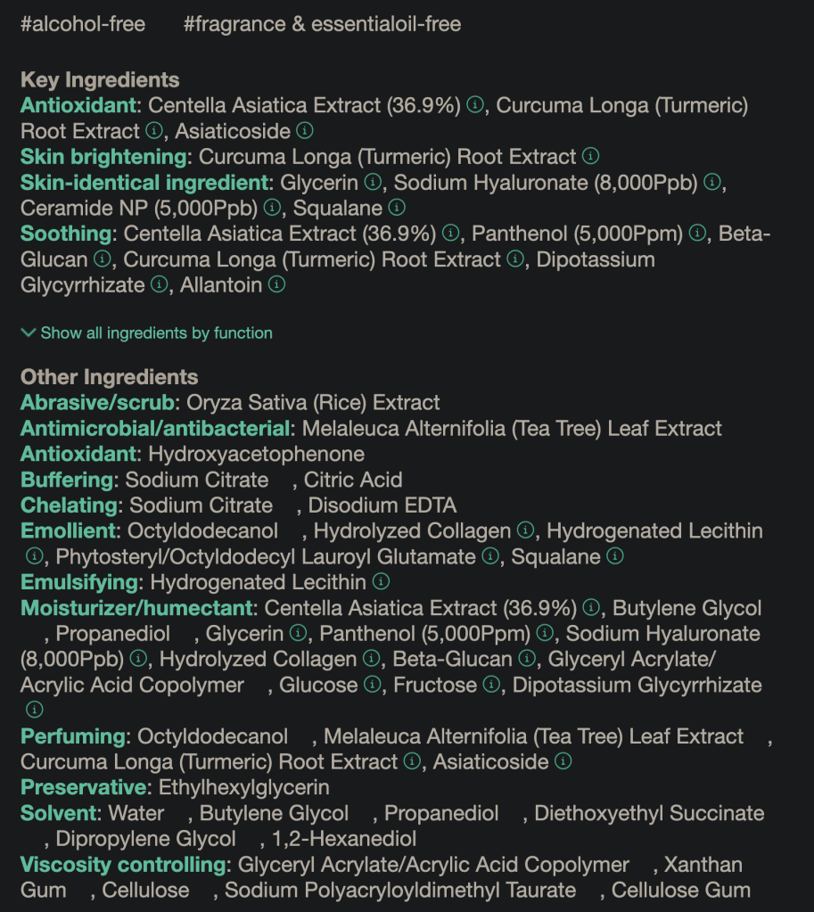 Centella Asiatica Extract auch bekannt als Gotu Kola oder asiatischer Wassernabel oder Tigergras. Das Zeug hat viele Namen und große Wirkung, zum Beispiel bei Beruhigung Wundheilung, da es die Hatzellen anregt. Sie hat auch entzündungshemmende und antibakterielle Wirkung wodurch sie bei zu Akne neigender Haut sehr hilfreich sein kann.