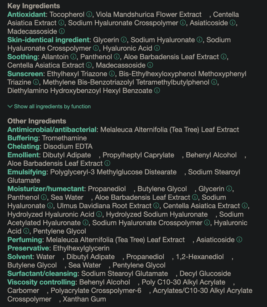 Tocopherol (Vitamin E), Centella Asiatica Extract (antibakteriell, Wundheilung), Sodium Hyaluronate (Anti-Falten Wirkung), Glycerin (Feuchtigkeit, Hautschutz), Hyaluronic Acid (Hautstraffung, Feuchtigkeit)