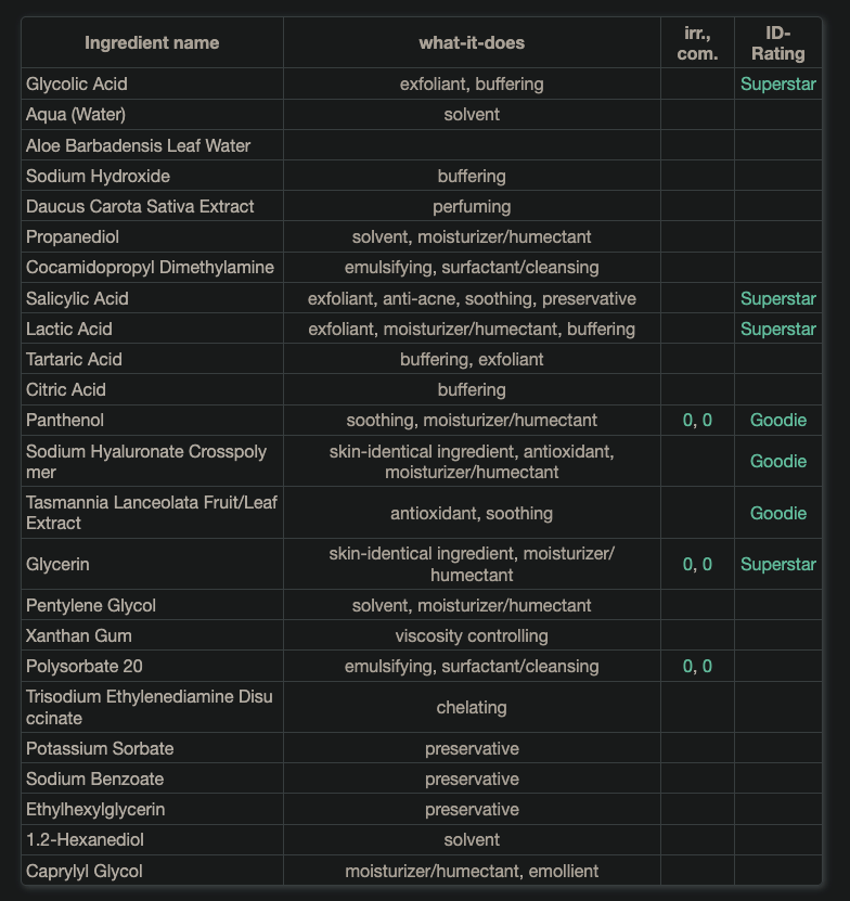Tartaric Acid (Weinsäure), ein AHA aus Weintrauben, unterstützt das chemische Peeling und hilft beim pH-Ausgleich der Formulierung.