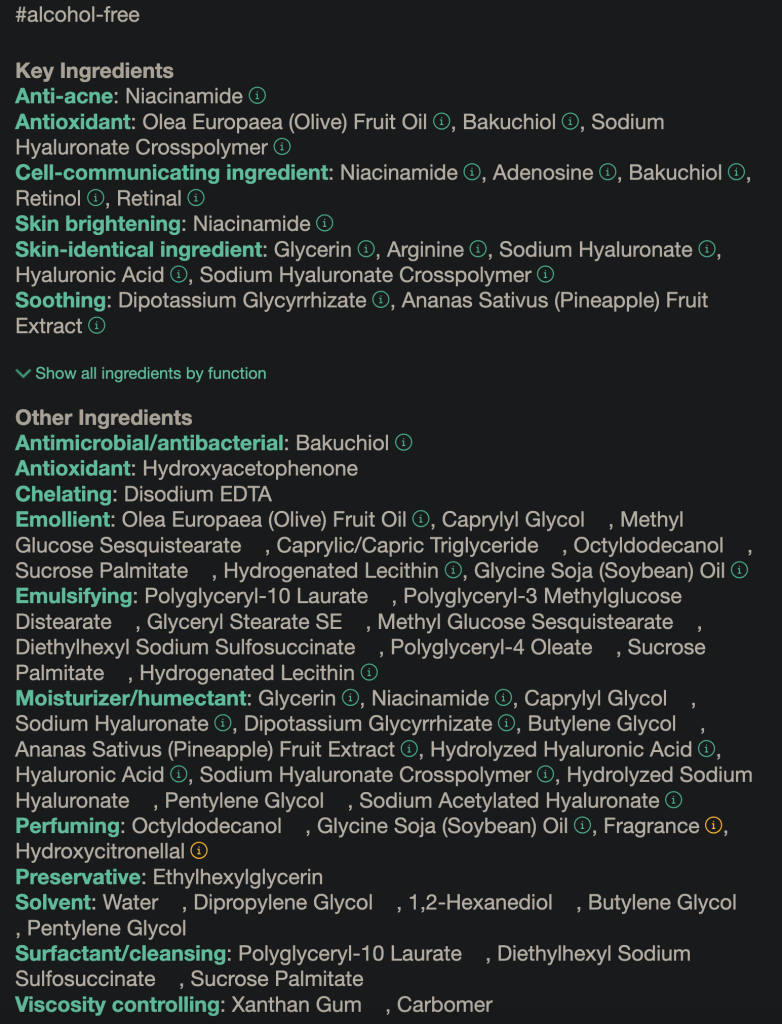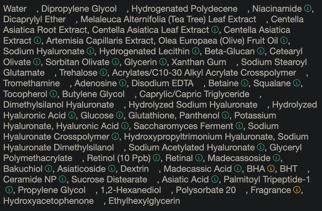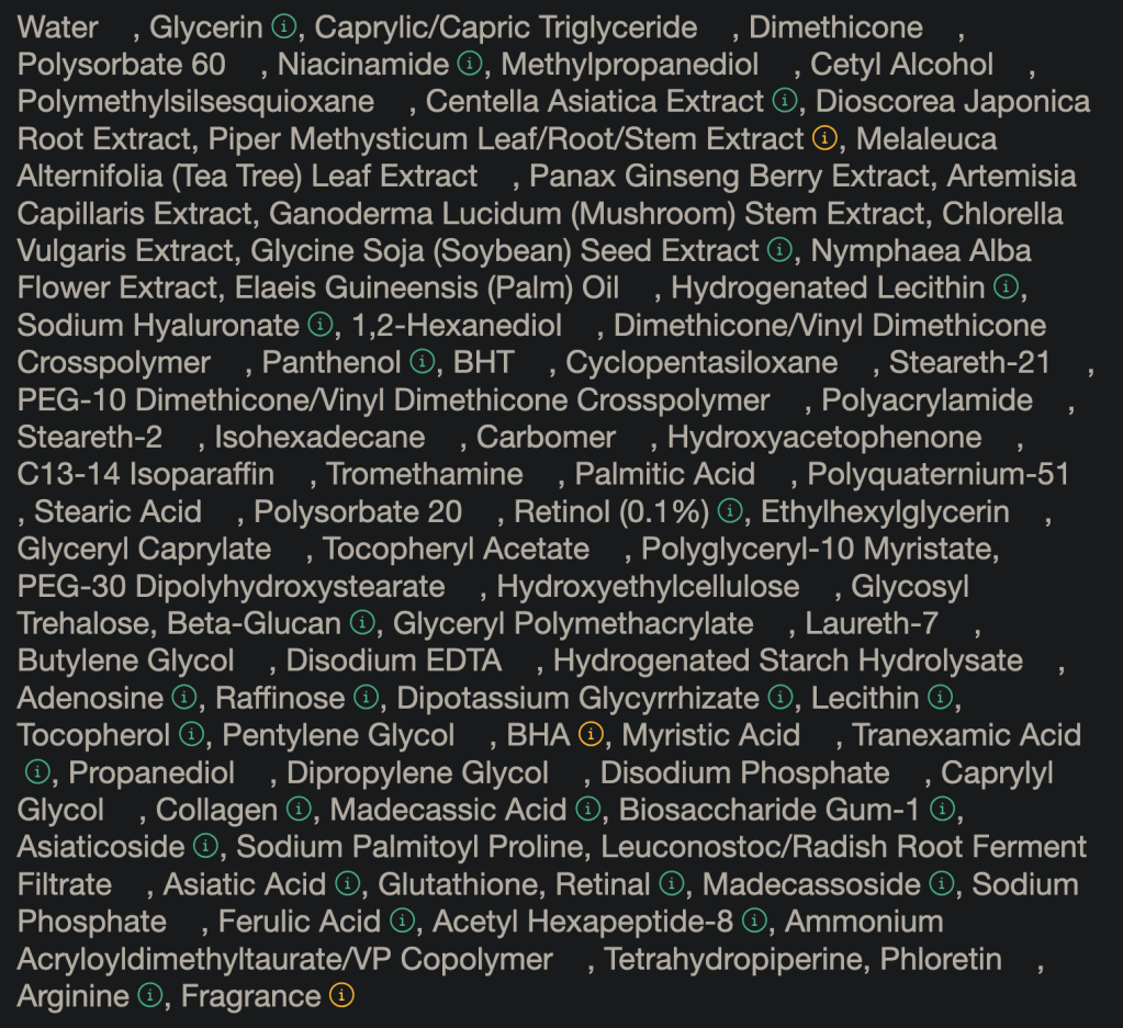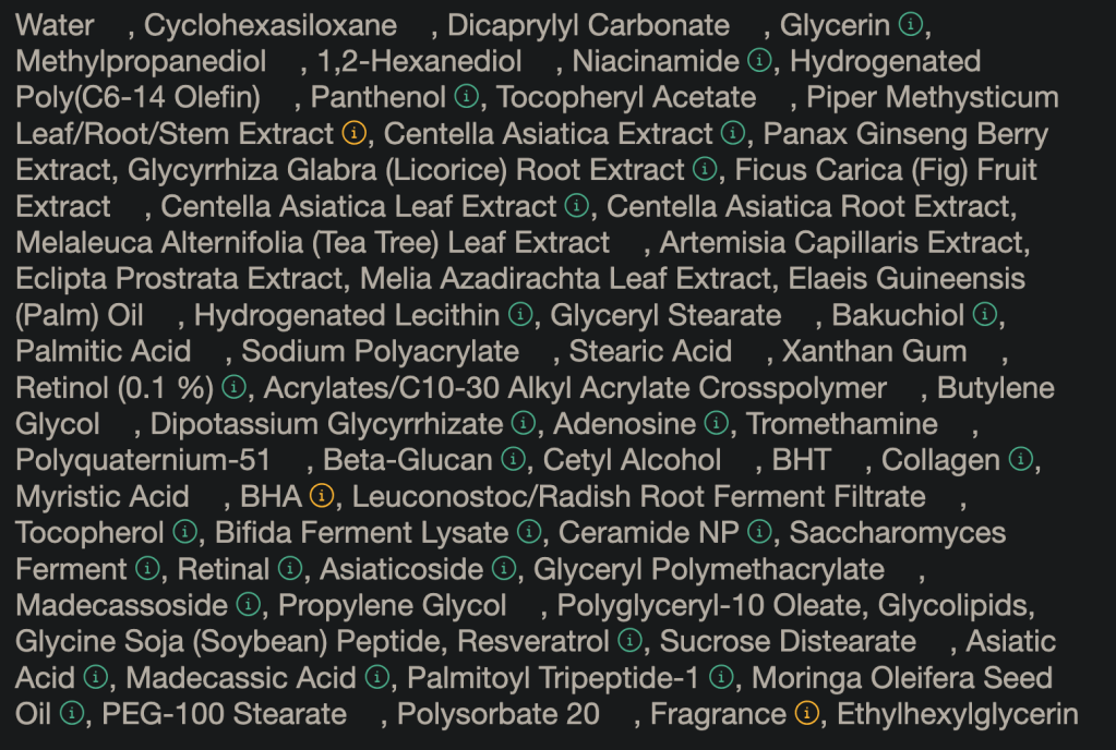 Das Serum enthält Retinol (10 ppb = 0.000001 %), Retinal und Bakuchiol in sehr geringer Konzentration. Es eignet sich daher gut für empfindliche Haut oder zum Einstieg in Retinolpflege. Begleitstoffe wie Centella, Panthenol und verschiedene Hyaluronsäureformen sorgen für Beruhigung und intensive Feuchtigkeit.