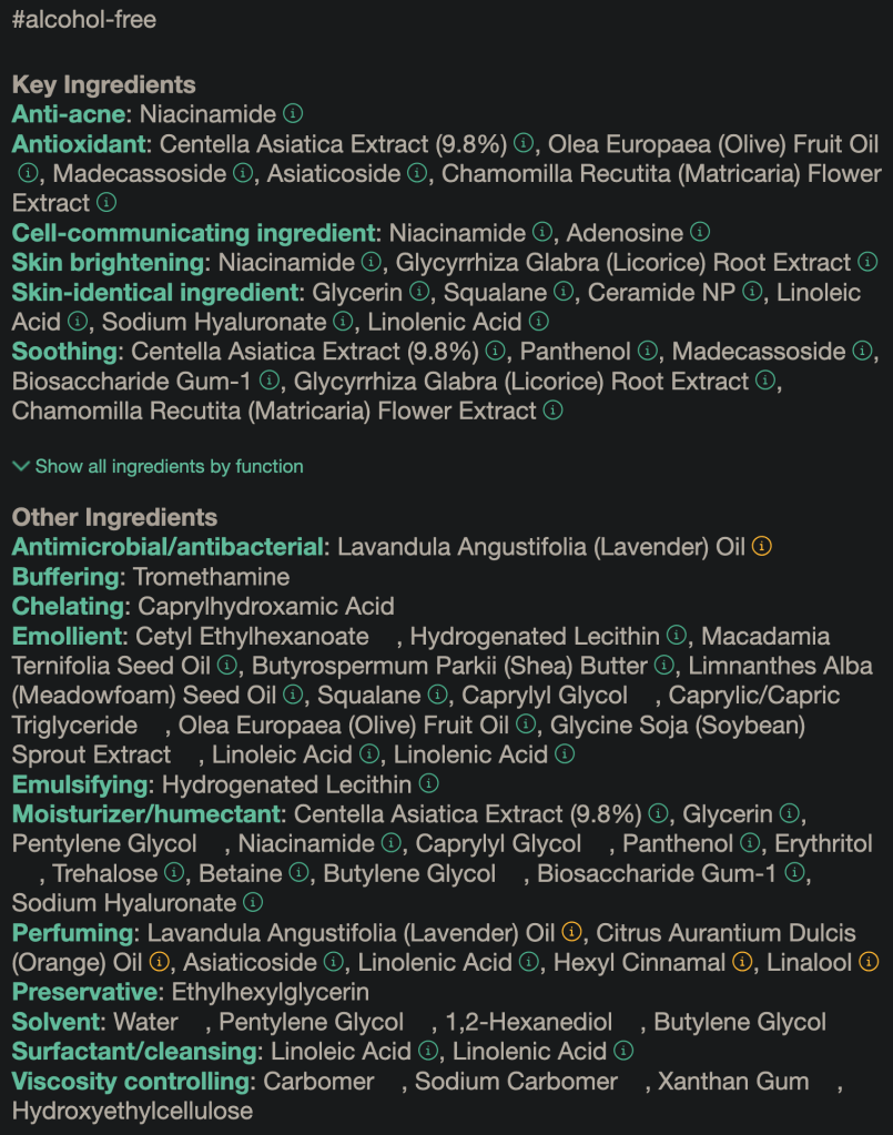 Textur: Die Textur fühlt sich nach dem Auftragen leicht klebrig an – das typische „smooth skin“-Gefühl bleibt daher aus. Im Vergleich zur Tea-Trica B5 Cream, die ein glattes, gepflegtes Finish hinterlässt, schneidet sie in diesem Punkt etwas schwächer ab.