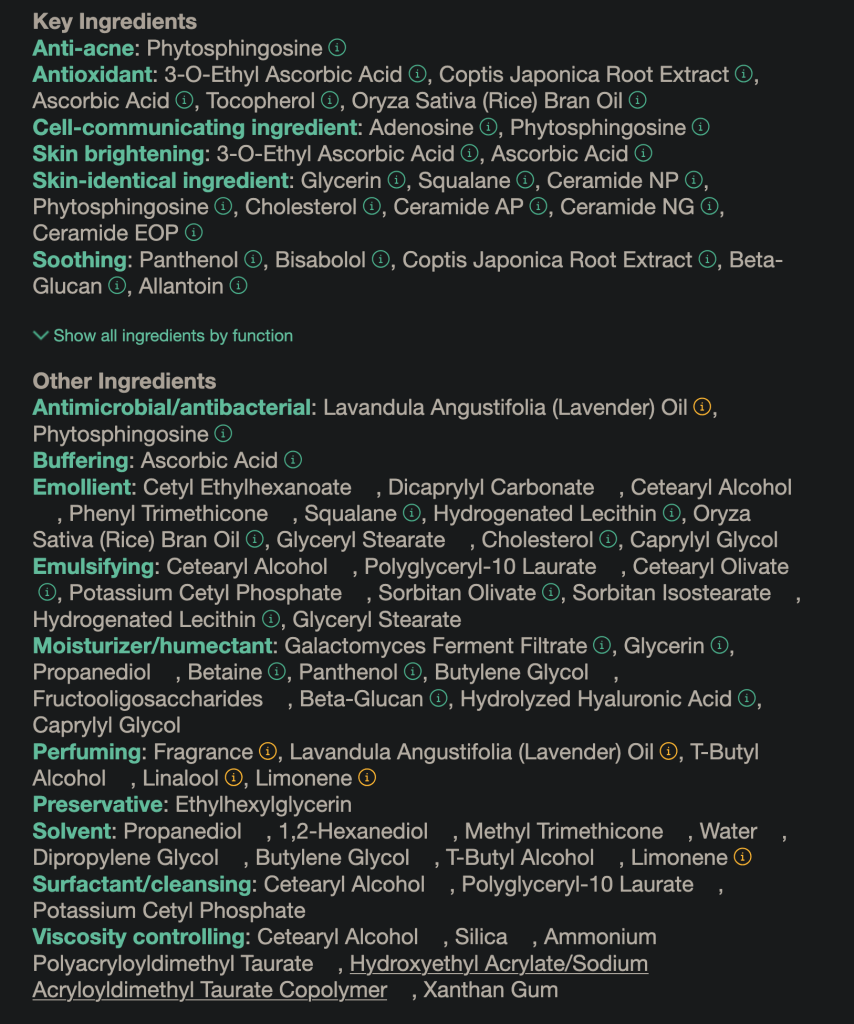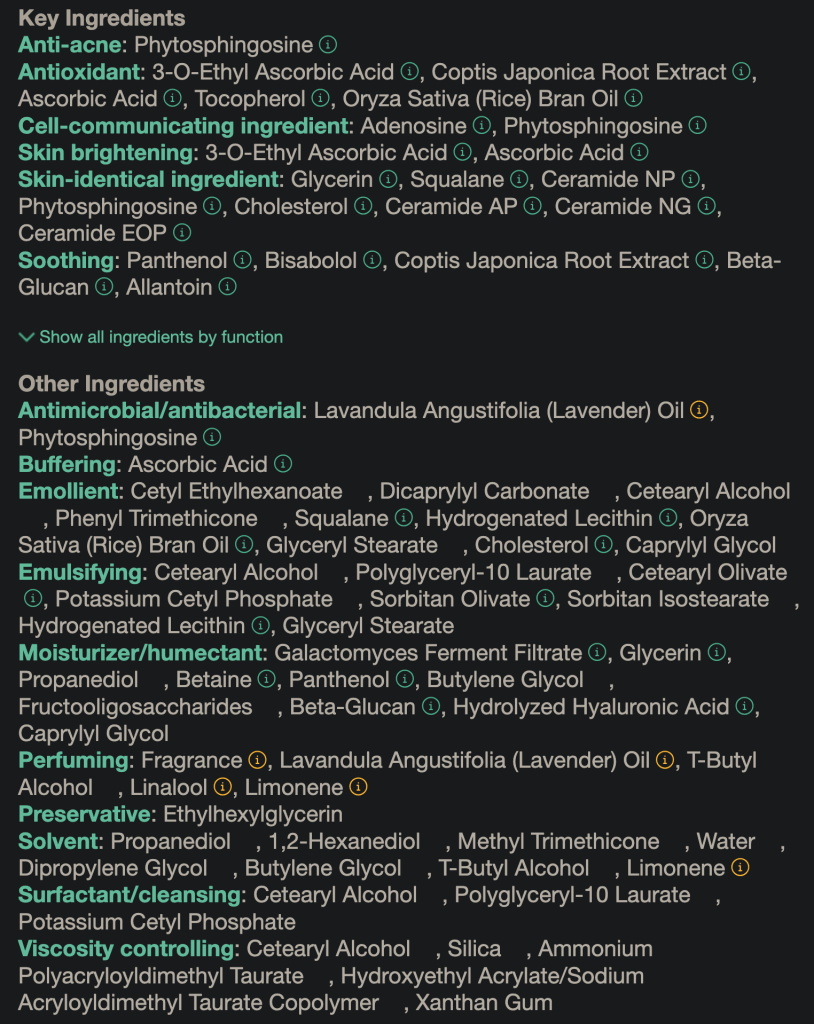 - Fructooligosaccharide & Ceramide (AP, AS, NP, etc.) → enthalten in Toner und Cream Wirkung: reparieren und stärken die Hautbarriere, besonders gut bei trockener oder geschwächter Haut.