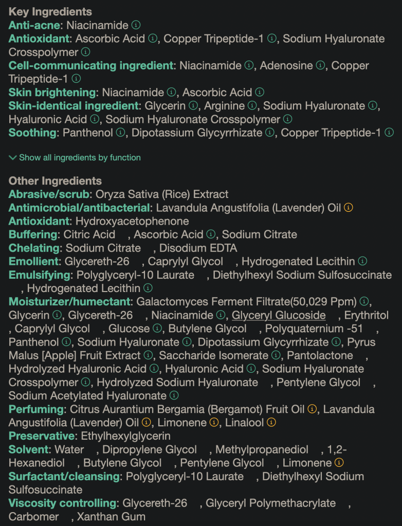- Enthält zusätzlich Gluconolactone (PHA) – mild peelend, verbessert Textur.