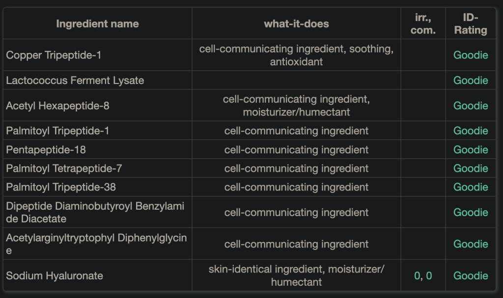 - Copper Tripeptide-1 (Kupferpeptid): Unterstützt die Hautregeneration, wirkt antioxidativ, fördert Kollagen- und Elastinproduktion. Der „Star“ des Produkts.