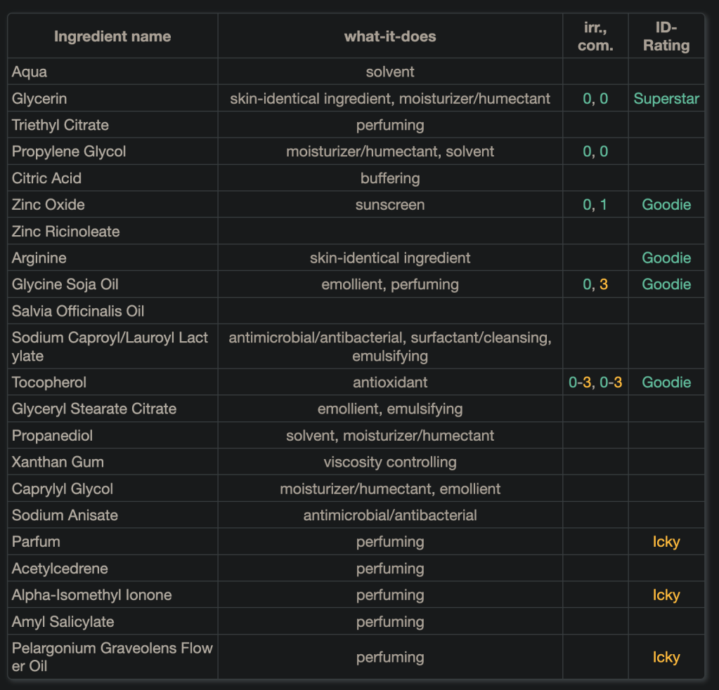 Glycine Soja Oil, Tapioca Starch, Sodium Bicarbonate, Stearyl Alcohol, Theobroma Cacao Seed Butter, Cellulose, Butyrospermum Parkii Butter, Zinc Oxide, Parfum, Helianthus Annuus Seed Cera, Tocopherol, Limonene, Linalool, Eugenol
