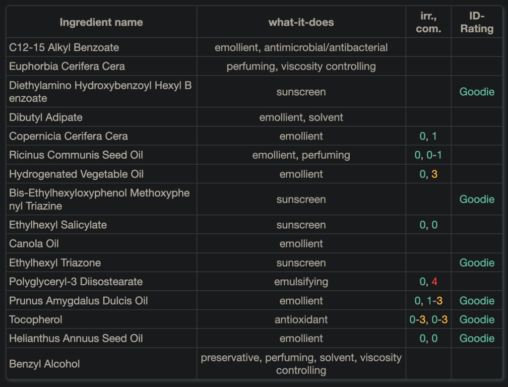 Glycine Soja Oil, Tapioca Starch, Sodium Bicarbonate, Stearyl Alcohol, Theobroma Cacao Seed Butter, Cellulose, Butyrospermum Parkii Butter, Zinc Oxide, Helianthus Annuus Seed Cera, Tocopherol, Helianthus Annuus Seed Oil, Parfum, Ascorbyl Palmitate, Limonene, Linalool, Citral, Geraniol, Citronellol