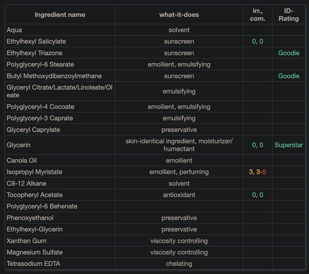Glycine Soja Oil, Tapioca Starch, Sodium Bicarbonate, Stearyl Alcohol, Theobroma Cacao Seed Butter, Cellulose, Butyrospermum Parkii Butter, Zinc Oxide, Parfum, Helianthus Annuus Seed Cera, Tocopherol, Helianthus Annuus Seed Oil, Ascorbyl Palmitate, Limonene, Linalool, Citral, Citronellol, Geraniol