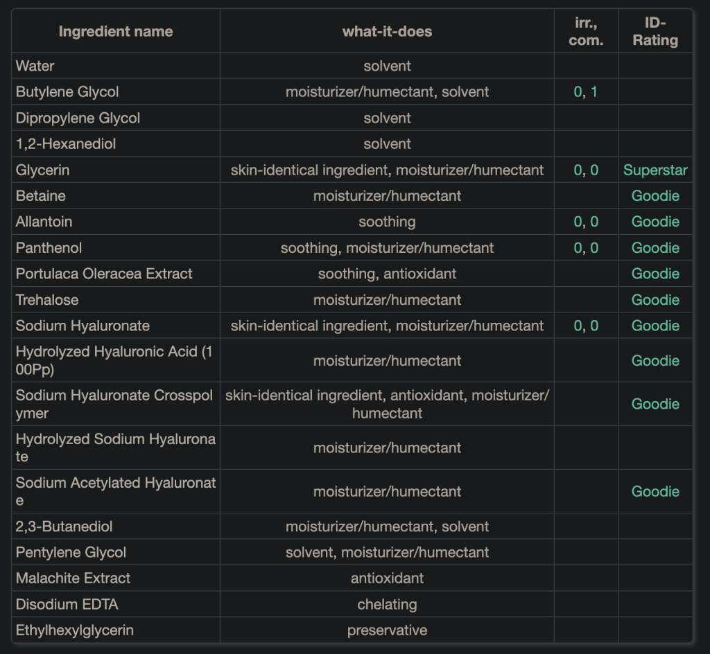 Glycerin, Butylene Glycol, Betaine, Trehalose, Panthenol, Allantoin → starke Feuchtigkeitsspender, beruhigend, glättend.