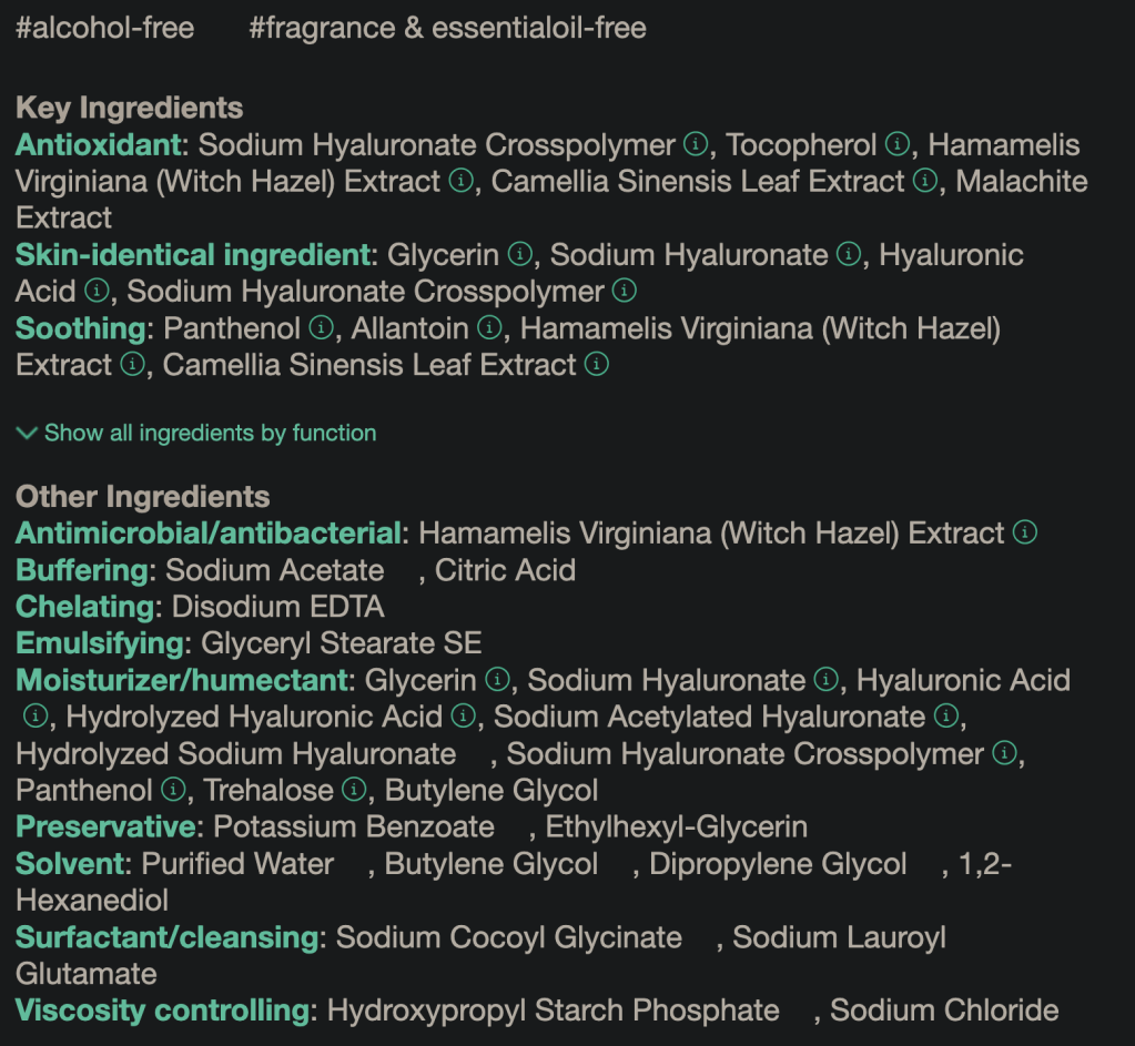 Sodium Hyaluronate, Hydrolyzed Hyaluronic Acid, Sodium Acetylated Hyaluronate, Sodium Hyaluronate Crosspolymer, Hydrolyzed Sodium Hyaluronate, Potassium Hyaluronate → verschiedene Hyaluronsäureformen, wirken auf unterschiedlichen Ebenen der Haut.