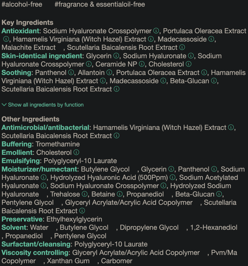 Ceramide NP, Cholesterol, Madecassoside, Madecassic Acid, Beta-Glucan → stärken die Hautbarriere, fördern Regeneration, lindern Rötungen.