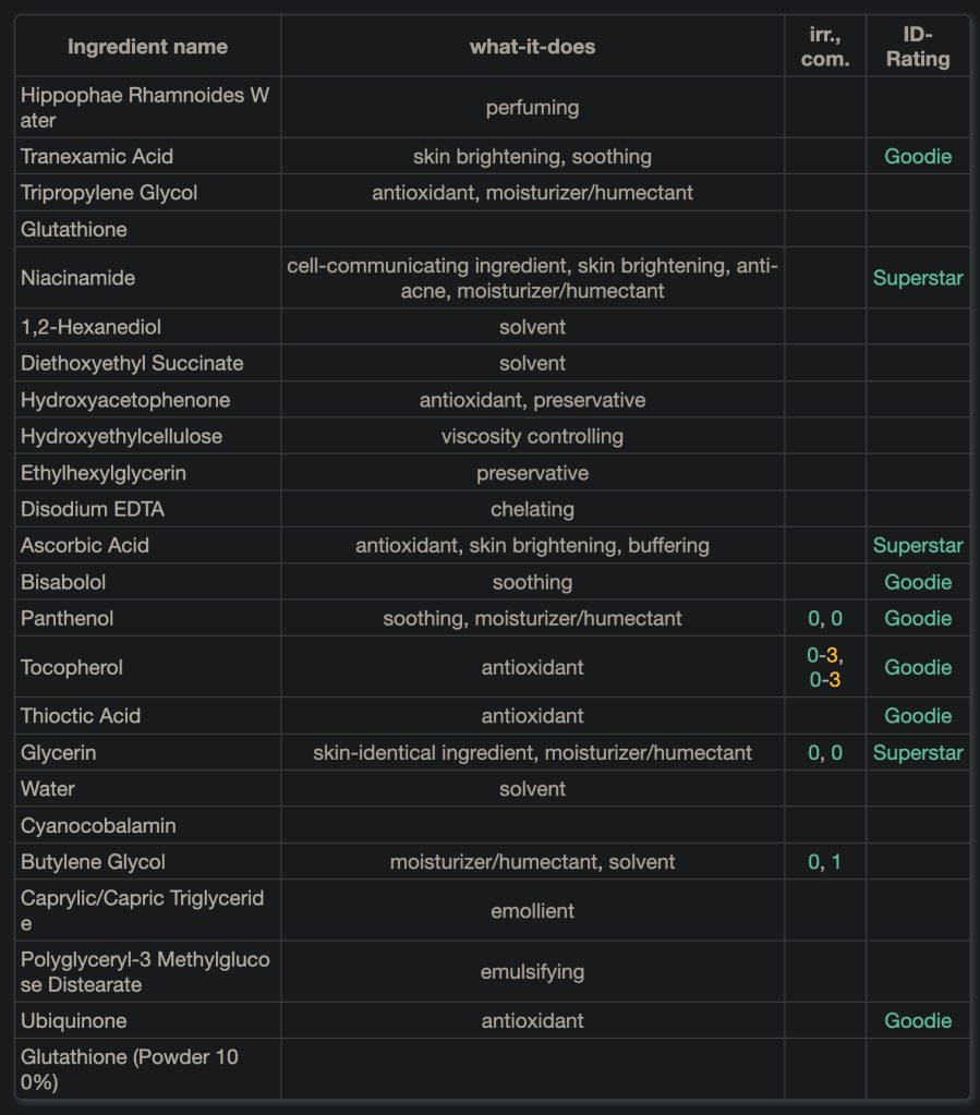 - Ascorbic Acid (Vitamin C), Tocopherol (Vitamin E), Thioctic Acid (Alpha-Liponsäure), Ubiquinone (Coenzym Q10): Ein massiver Antioxidantien-Komplex, der die Haut schützt und aufhellt.