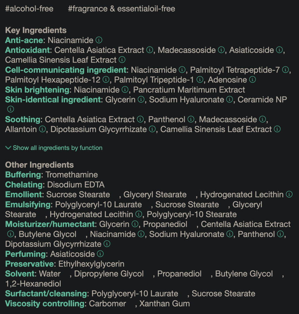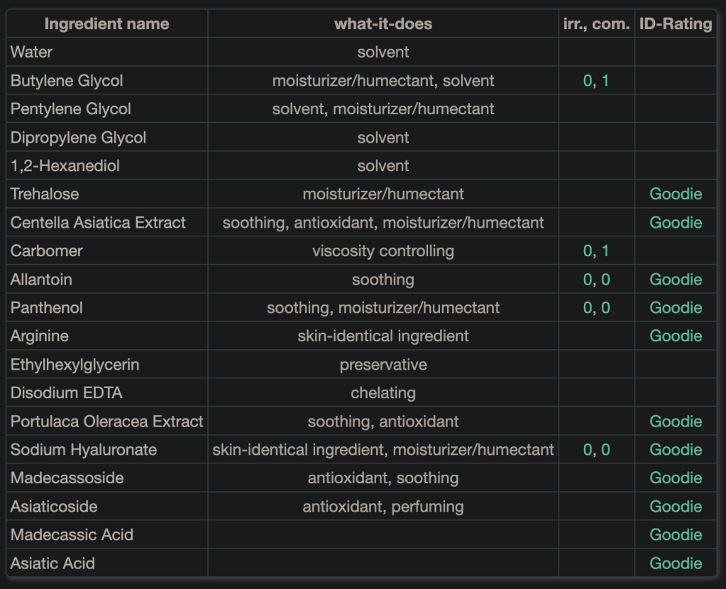 Meinung: Ich denke die Reihe ist ok. Der Toner hat nichts besonderes und wirkt beruhigend, feuchtigkeitsspendend. Auch das Serum ist darauf ausgelegt plus Niacinamide. Aber die Dosis ist zu gering für echte Wirkung. Die Creme finde ich zu dick. Sie zieht nicht gut ein und man kann sie noch am nächsten Tag auf der Haut spüren. Das ist nicht ideal besonders nicht im Sommer. Probieren kann man es gerne. Eventuell für trockene Haut ideal.