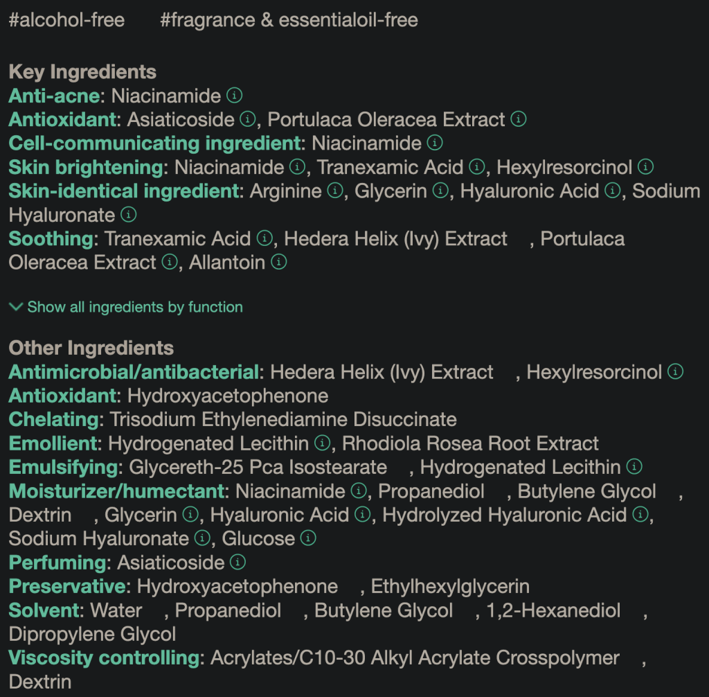 Niacinamide, Glutathione und Tranexamic Acid sind mit die stärksten Aufheller und alle 3 zusammen in einem Serum ist super. Fehlt nur das Alpha Arbutin aber man kann ja nicht alles haben. Gerne hätte ich noch gewusst in welcher Konzentration die anderen Inhaltsstoffe drin sind aber dazu gabs leider keine Information. Schade.
